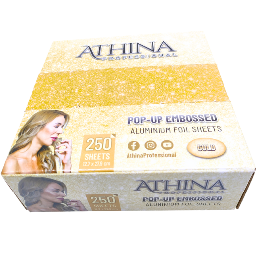 Folie aluminiu POP-UP embosata ATHINA, pre-taiata, ideala pentru vopsire si suvite in saloane profesionale. Aderenta buna si stabilitate sporita a suvitelor in timpul colorarii. Set 250 bucati, format 12.7 x 27.9 cm.