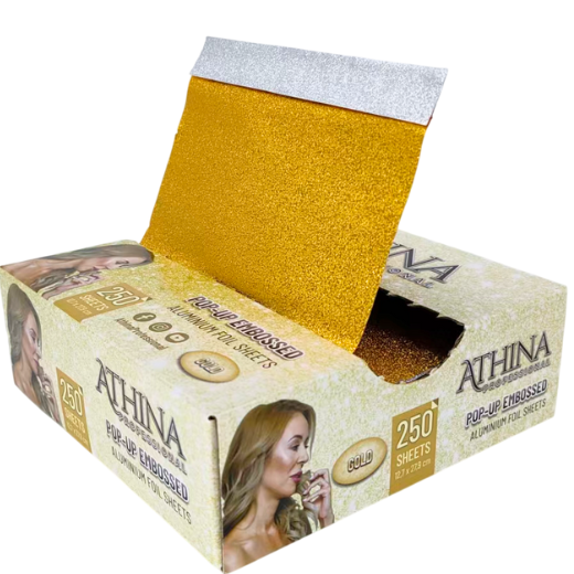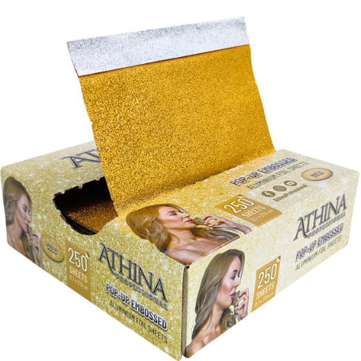 Folie aluminiu POP-UP embosata ATHINA, pre-taiata, ideala pentru vopsire si suvite in saloane profesionale. Aderenta buna si stabilitate sporita a suvitelor in timpul colorarii. Set 250 bucati, format 12.7 x 27.9 cm.