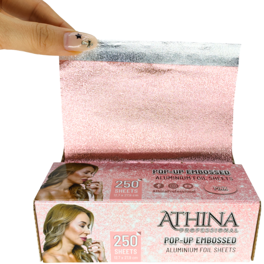 Folie aluminiu POP-UP embosata ATHINA, pre-taiata, ideala pentru vopsire si suvite in saloane profesionale. Aderenta buna si stabilitate sporita a suvitelor in timpul colorarii. Set 250 bucati, format 12.7 x 27.9 cm.